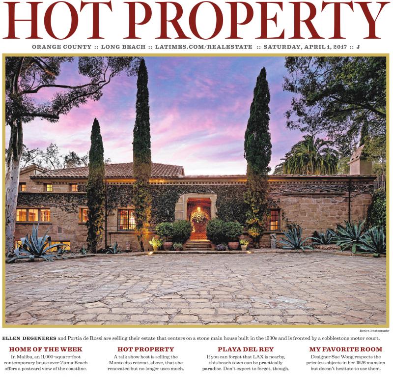 HOT PROPERT Y ORANGE COUNTY :: LONG BEACH :: LATIMES.COM/REALESTATE :: SATURDAY, APRIL 1, 2017 :: J Berlyn Photography ELLEN DEGENERES and Portia de Rossi are selling their estate that centers on a stone main house built in the 1930s and is fronted by a cobblestone motor court. HOME OF THE WEEK In Malibu, an 11,000-square-foot contemporary house over Zuma Beach offers a postcard view of the coastline. HOT PROPERTY A talk show host is selling the Montecito retreat, above, that she renovated but no longer uses much. PLAYA DEL REY If you can forget that LAX is nearby, this beach town can be practically paradise. Don’t expect to forget, though. MY FAVORITE ROOM Designer Sue Wong respects the priceless objects in her 1926 mansion but doesn’t hesitate to use them.