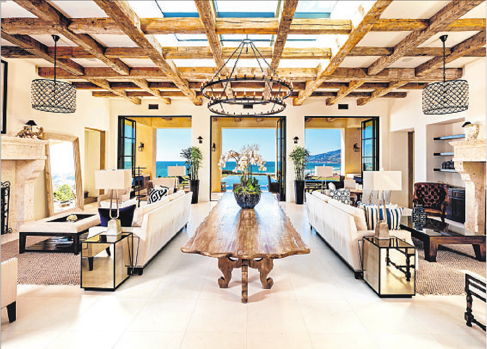Features: Beamed ceilings; stone and hardwood floors; wroughtiron chandeliers; custom steelframed windows and doors; great room with two fireplaces; centerisland kitchen; theater room; game room; wine cellar; outdoor kitchen; swimming pool and spa