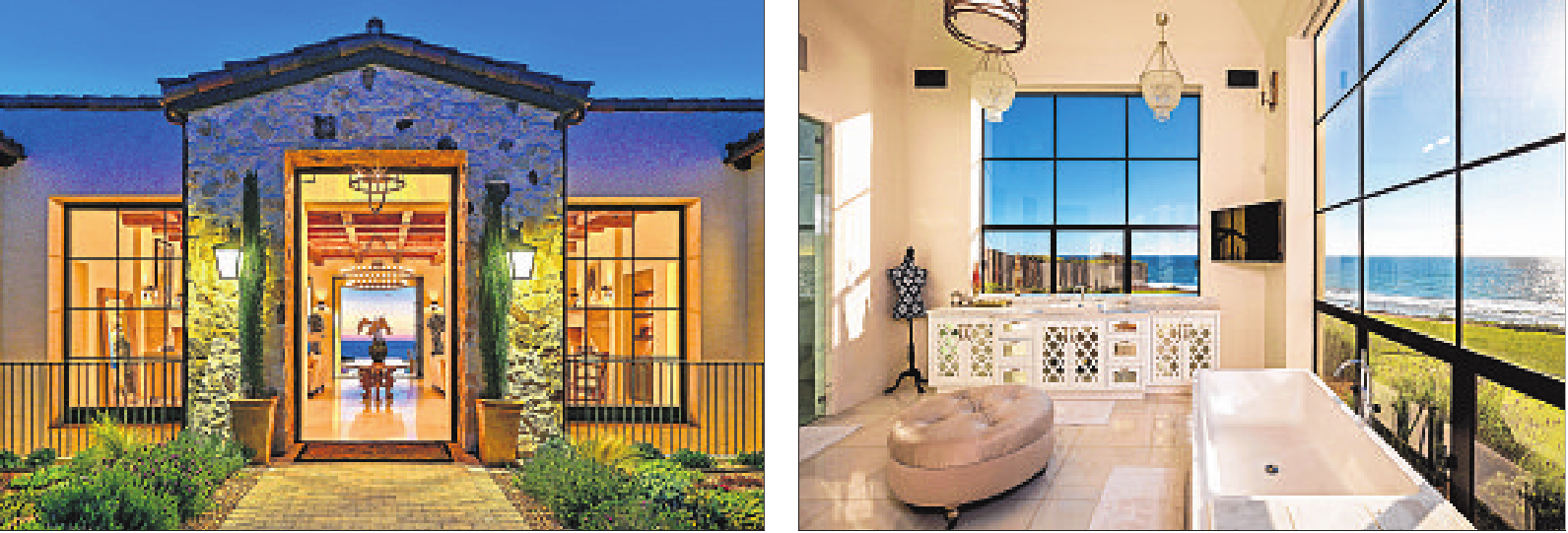 Designed for indoor-outdoor entertaining, the home has bifolding doors that open to a covered patio and a lighted swimming pool that extends toward the coastline and horizon.