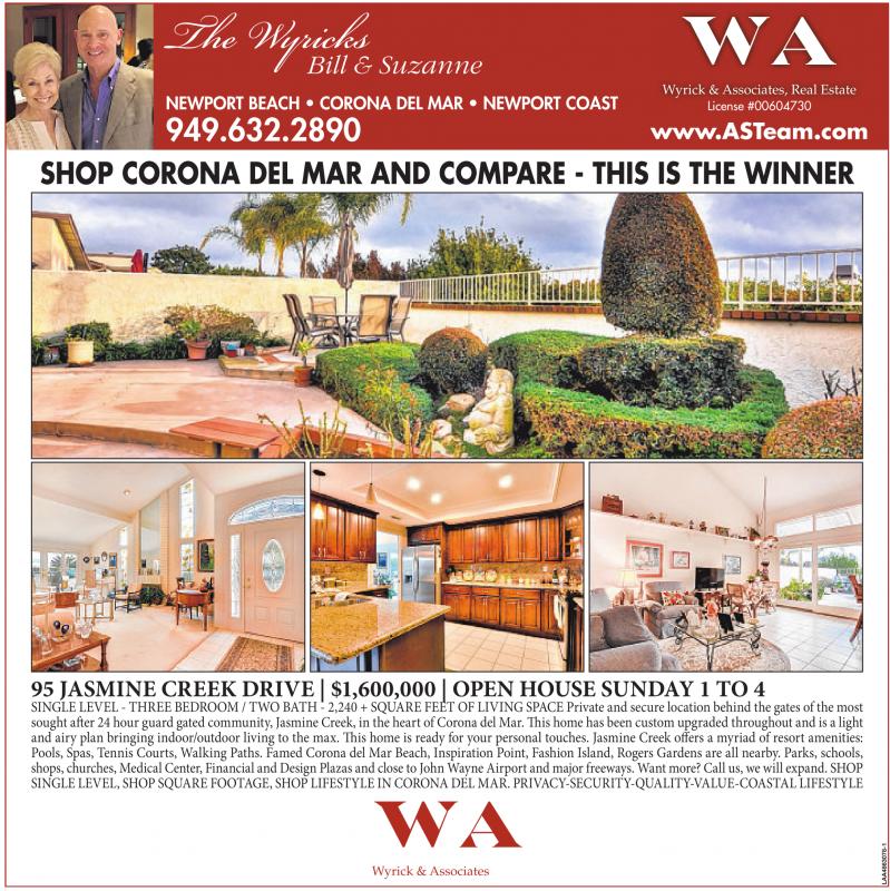 The Wyricks Bill & Suzanne NEWPORT BEACH • CORONA DEL MAR • NEWPORT COAST Wyrick & Associates, Real Estate License #00604730 949.632.2890 www.ASTeam.com SHOP CORONA DEL MAR AND COMPARE - THIS IS THE WINNER 95 JASMINE CREEK DRIVE | $1,600,000 | OPEN HOUSE SUNDAY 1 TO 4 SINGLE LEVEL - THREE BEDROOM / TWO BATH - 2,240 + SQUARE FEET OF LIVING SPACE Private and secure location behind the gates of the most sought after 24 hour guard gated community, Jasmine Creek, in the heart of Corona del Mar. This home has been custom upgraded throughout and is a light and airy plan bringing indoor/outdoor living to the max. This home is ready for your personal touches. Jasmine Creek offers a myriad of resort amenities: Pools, Spas, Tennis Courts, Walking Paths. Famed Corona del Mar Beach, Inspiration Point, Fashion Island, Rogers Gardens are all nearby. Parks, schools, shops, churches, Medical Center, Financial and Design Plazas and close to John Wayne Airport and major freeways. Want more? Call us, we will expand. SHOP SINGLE LEVEL, SHOP SQUARE FOOTAGE, SHOP LIFESTYLE IN CORONA DEL MAR. PRIVACY-SECURITY-QUALITY-VALUE-COASTAL LIFESTYLE