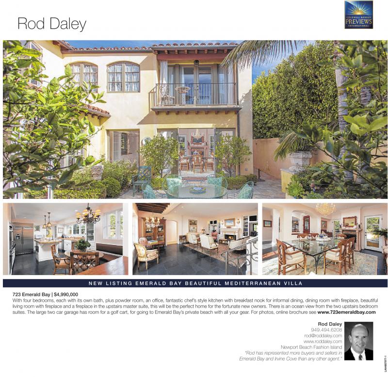 Rod Daley N E W L I S T I N G E M E R A L D B AY B E A U T I F U L M E D I T E R R A N E A N V I L L A 723 Emerald Bay | $4,990,000 With four bedrooms, each with its own bath, plus powder room, an office, fantastic chef’s style kitchen with breakfast nook for informal dining, dining room with fireplace, beautiful living room with fireplace and a fireplace in the upstairs master suite, this will be the perfect home for the fortunate new owners. There is an ocean view from the two upstairs bedroom suites. The large two car garage has room for a golf cart, for going to Emerald Bay’s private beach with all your gear. For photos, online brochure see www.723emeraldbay.com Rod Daley 949.494.6208 rod@roddaley.com www.roddaley.com Newport Beach Fashion Island “Rod has represented more buyers and sellers in Emerald Bay and Irvine Cove than any other agent.”