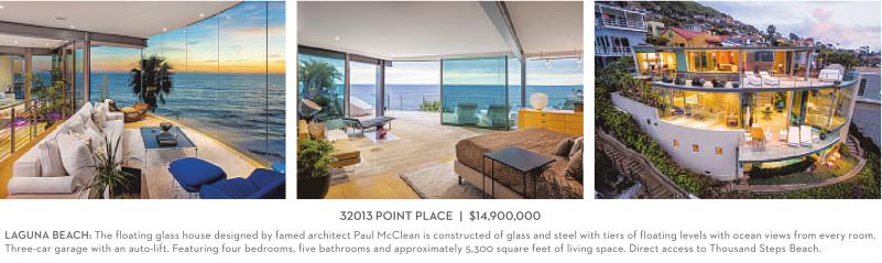 LAGUNA BEACH: The floating glass house designed by famed architect Paul McClean is constructed of glass and steel with tiers of floating levels with ocean views from every room. Three-car garage with an auto-lift. Featuring four bedrooms, five bathrooms and approximately 5,300 square feet of living space. Direct access to Thousand Steps Beach.