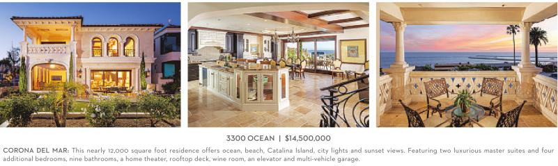 CORONA DEL MAR: This nearly 12,000 square foot residence offers ocean, beach, Catalina Island, city lights and sunset views. Featuring two luxurious master suites and four additional bedrooms, nine bathrooms, a home theater, rooftop deck, wine room, an elevator and multi-vehicle garage.