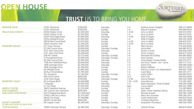 MISSION VIEJO...........................................27301 Monforte $799,000 Saturday 1-4 DeAnne Amen Padgett 949.212.8699 27301 Monforte $799,000 Sunday 1-4 Marcie Friedman 949.606.6610 NELLIE GAIL RANCH ..................................25502 Rodeo Circle $3,595,000 Saturday 1-4:30 Jerry La Mott 949.472.9191 25422 Gallup Circle $2,550,000 Sunday 1-4 Jerry La Mott 949.472.9191 25291 Rockridge Road $1,995,000 Saturday 1-4:30 Kelly O'Hagan 949.292.5636 25252 Derbyhill Drive $1,950,000 Sunday 1-4 Kelly O'Hagan 949.292.5636 26016 Red Corral Road $1,675,000 Sunday 1-4:30 Jerry La Mott 949.472.9191 26341 Houston Trail $1,295,000 Sunday 1-4:30 Jerry La Mott 949.472.9191 NEWPORT BEACH ......................................227 Onyx Avenue $3,995,000 Sunday 1-4 Mary Kontra 714.403.6500 22 Old Course Drive $3,850,000 Saturday | Sunday 1-4 Jenna Bahl 949.887.8725 2731 Alta Vista Drive $3,299,000 Saturday 1-4 DeAnn Carroll 949.636.4783 2731 Alta Vista Drive $3,299,000 Sunday 1-4 Kristi Cousens 949.677.5554 208 43 rd Street $3,175,000 Saturday | Sunday 1-4 Michaela McCloskey 949.887.8602 4 Thunderbird Drive $2,995,000 Saturday | Sunday 1-4 Kevin Kanda 714.612.0529 40 Old Course Drive $2,995,000 Saturday 2-4 Amie Raiger | Kandy Petillo 949.375.4171 1706 Port Sheffield Place $2,649,000 Saturday 1-4 Jim Kline | Alexei "Lex" Sarna 949.717.7123 1606 Santiago Drive $2,199,000 Saturday 1-4 Esther Fine 949.466.6483 1606 Santiago Drive $2,199,000 Sunday 1-4 Robert Milliken 949.212.1970 40 Hillsdale Drive $1,895,000 Sunday 1-4 Patricia Carson | Jim Weisenbach 949.922.7399 42 Rue Fontainbleau $1,795,000 Sunday 1-4 Carol Berg 949.351.4171 521 Gorgonia $1,194,000 Saturday | Sunday 1-4 Kathy Fallon 949.887.0972 400 Vista Suerte $859,000 Saturday 12-3 John Vitti 949.629.0935 2218 Vista Hogar $759,000 Saturday | Sunday 1-3:30 Donna Peebles 949.500.1858 NEWPORT COAST ......................................26 Surfspray Bluff $4,658,880 Sunday 1:30 – 4:30 Jesse Barraza 714.292.2497 1 Wayside $3,595,000 Saturday 1-4 Mark Ravanpak | Shala Emdadi 949.395.4688 21 San Pietro $1,625,000 Saturday Appt. Carrie Adam 949.322.3985 NORTH TUSTIN...........................................18612 Medford Avenue $1,225,000 Sunday 1-4 Kris Wells 714.287.8900 SAN CLEMENTE ..........................................341 Camino San Clemente $635,000 Saturday 1-4 Helen Thole | Heather Atkins 949.291.5024 SAN JUAN CAPISTRANO............................32275 Peppertree Bend $11,500,000 Sunday 1-4 Rhonda Russell 949.395.7399 27442 Calle De La Rosa $2,375,000 Sunday 2-5 Mary Ann Azzolina 949.280.3911 28432 Via Ordaz $1,198,888 Sunday 1-4 Susan McDonnell 949.632.0544 28335 Via Del Mar $930,000 Sunday 1-4 Chandra Moschina 949.293.5883 SHADY CANYON ® ......................................46 Copper Creek $6,495,000 Saturday | Sunday 1-4 Jacqueline Thompson 949.326.3392 Forgateaccess,pleasecallagentslisted. TUSTIN RANCH...........................................10945 Silverado Terrace $2,485,000 Saturday | Sunday 1-4 Soheila Shirazi 949.874.0604