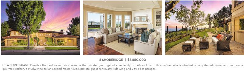 5 SHORERIDGE | $8,650,000 NEWPORT COAST: Possibly the best ocean view value in the private, guard-gated community of Pelican Crest. This custom villa is situated on a quite cul-de-sac and features a gourmet kitchen, a study, wine cellar, second master suite, private guest sanctuary, kids wing and 2 two-car garages.