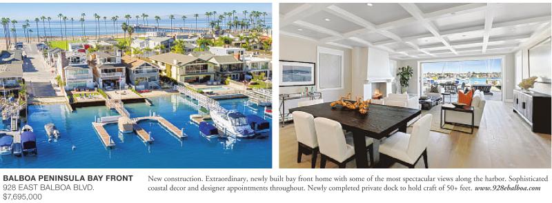 BALBOA PENINSULA BAY FRONT 928 EAST BALBOA BLVD. $7,695,000 New construction. Extraordinary, newly built bay front home with some of the most spectacular views along the harbor. Sophisticated coastal decor and designer appointments throughout. Newly completed private dock to hold craft of 50+ feet. www.928ebalboa.com