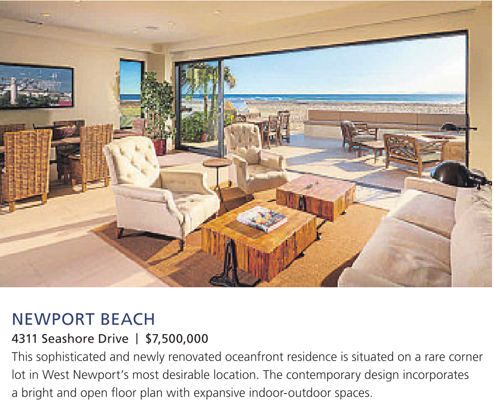 4311 Seashore Drive | $7,500,000 This sophisticated and newly renovated oceanfront residence is situated on a rare corner lot in West Newport’s most desirable location. The contemporary design incorporates a bright and open floor plan with expansive indoor-outdoor spaces.