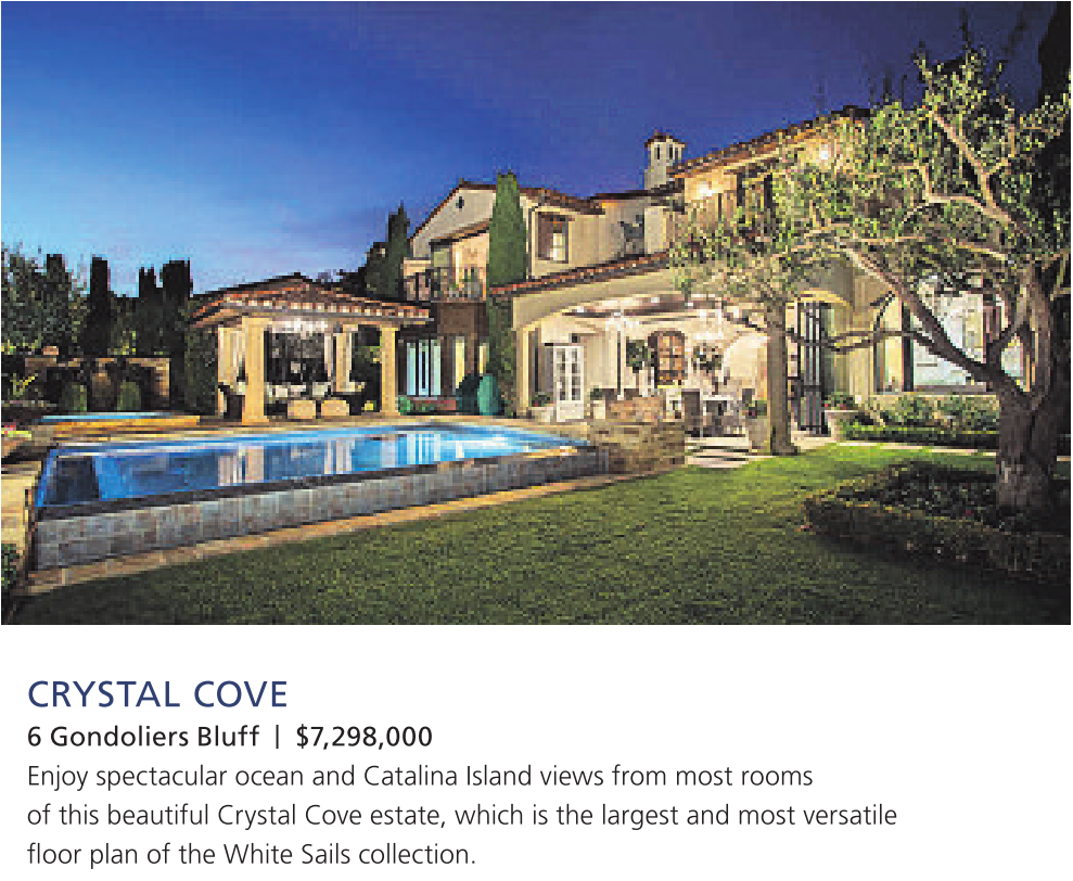 6 Gondoliers Bluff | $7,298,000 Enjoy spectacular ocean and Catalina Island views from most rooms of this beautiful Crystal Cove estate, which is the largest and most versatile floor plan of the White Sails collection.