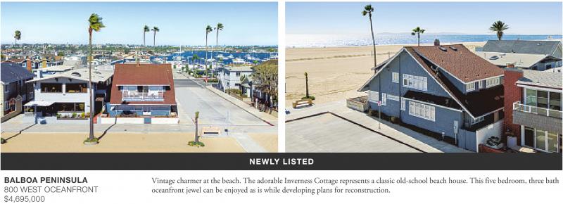 NEWLY LISTED BALBOA PENINSULA 800 WEST OCEANFRONT $4,695,000 Vintage charmer at the beach. The adorable Inverness Cottage represents a classic old-school beach house. This five bedroom, three bath oceanfront jewel can be enjoyed as is while developing plans for reconstruction.