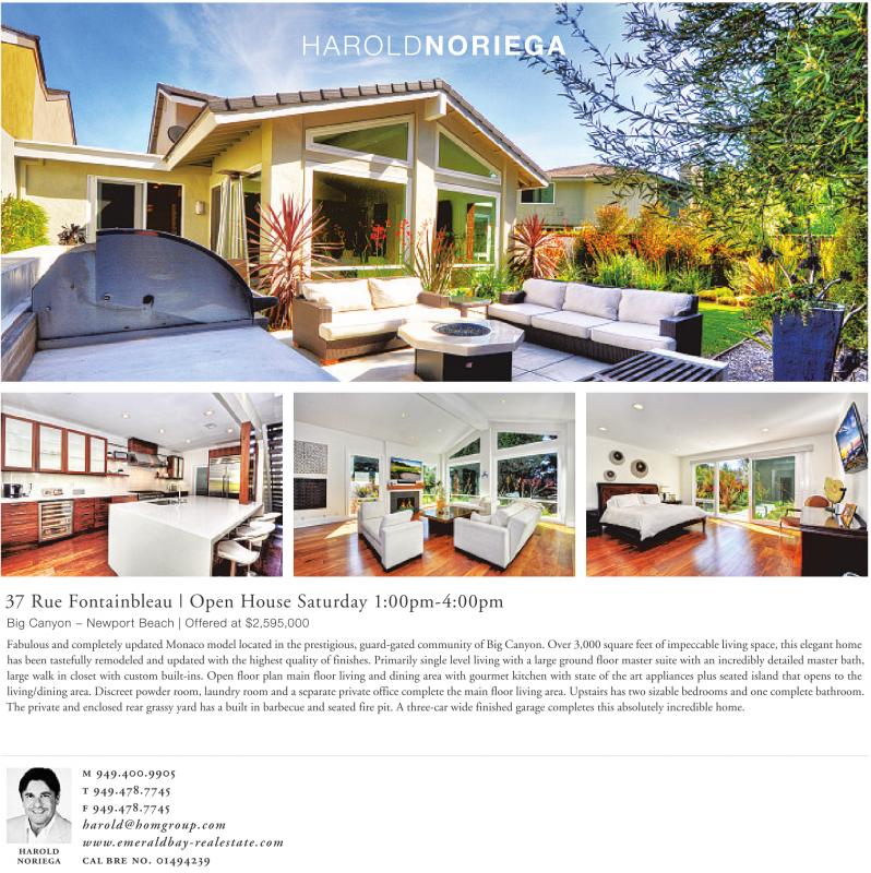37 Rue Fontainbleau | Open House Saturday 1:00pm-4:00pm Big Canyon Newport Beach | Offered at $2,595,000 Fabulous and completely updated Monaco model located in the prestigious, guard-gated community of Big Canyon. Over 3,000 square feet of impeccable living space, this elegant home has been tastefully remodeled and updated with the highest quality of finishes. Primarily single level living with a large ground floor master suite with an incredibly detailed master bath, large walk in closet with custom built-ins. Open floor plan main floor living and dining area with gourmet kitchen with state of the art appliances plus seated island that opens to the living/dining area. Discreet powder room, laundry room and a separate private office complete the main floor living area. Upstairs has two sizable bedrooms and one complete bathroom. The private and enclosed rear grassy yard has a built in barbecue and seated fire pit. A three-car wide finished garage completes this absolutely incredible home. harold noriega m 949.400.9905 t 949.478.7745 f 949.478.7745 harold@homgroup.com www.emeraldbay-realestate.com cal bre no. 01494239