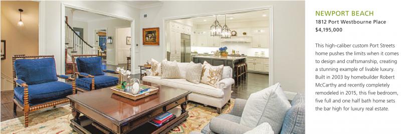 NEWPORT BEACH 1812 Port Westbourne Place $4,195,000 This high-caliber custom Port Streets home pushes the limits when it comes to design and craftsmanship, creating a stunning example of livable luxury. Built in 2003 by homebuilder Robert McCarthy and recently completely remodeled in 2015, this five bedroom, five full and one half bath home sets the bar high for luxury real estate. See also