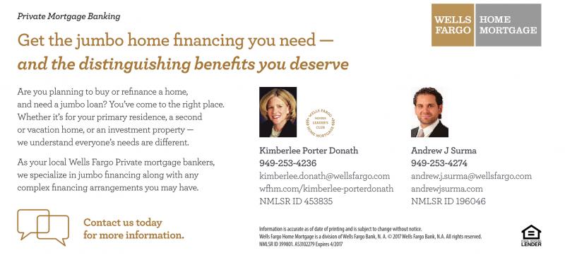 As your local Wells Fargo Private mortgage bankers, we specialize in jumbo financing along with any complex financing arrangements you may have.