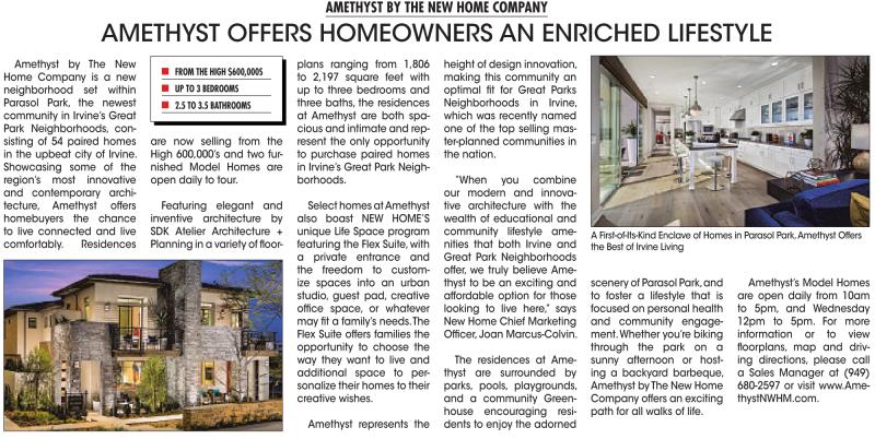 “When you combine our modern and innovative architecture with the wealth of educational and community lifestyle amenities that both Irvine and Great Park Neighborhoods offer, we truly believe Amethyst to be an exciting and affordable option for those looking to live here,” says New Home Chief Marketing Officer,Joan Marcus-Colvin.