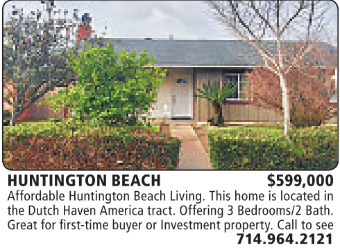 HUNTINGTON BEACH $599,000 Affordable Huntington Beach Living. This home is located in the Dutch Haven America tract. Offering 3Bedrooms/2 Bath. Great for first-time buyer orInvestment property. Call tosee 714.964.2121