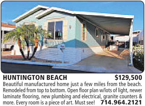 HUNTINGTON BEACH $129,500 Beautiful manufactured home just afew miles from the beach. Remodeledfrom top to bottom. Open floorplanw/lotsoflight,newer laminate flooring, new plumbing and electrical, granite counters & more.Every room is apiece of art. Mustsee! 714.964.2121