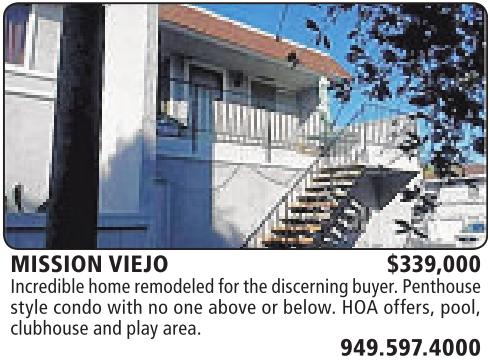 MISSION VIEJO $339,000 Incredible homeremodeledfor thediscerningbuyer.Penthouse style condo with noone above or below. HOA offers, pool, clubhouseand play area.