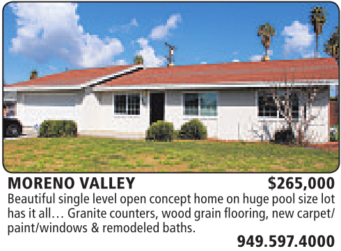 MORENO VALLEY $265,000 Beautifulsinglelevel openconcept homeonhugepoolsize lot has it all… Granitecounters,wood grain flooring,new carpet/ paint/windows&remodeledbaths.