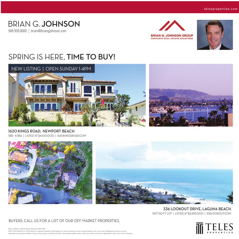 telesproperties.com BRIAN G. JOHNSON 949.939.8000 | brian@briangjohnson.com SPRING IS HERE, TIME TO BUY! NEW LISTING | OPEN SUNDAY 1-4PM 1620 KINGS ROAD, NEWPORT BEACH 5BD 4.5BA | LISTED AT $4,100,000 | 1620KINGSROAD.COM BUYERS, CALL US FOR A LIST OF OUR OFF MARKET PROPERTIES. Brian G. Johnson: California Bureau Real Estate #00787688 ©2017 TelesProperties,Inc.TelesPropertiesisaregisteredtrademark. TelesProperties, Inc. does not guarantee accuracyofsquarefootage,lot size, room count,buildingpermit statusorany other information concerning thecondition or features of thepropertyprovided by theseller or obtained from public records or other sources. Buyerisadvised to independently verify accuracy of theinformation. 336 LOOKOUT DRIVE, LAGUNA BEACH 16117 SQ FT LOT | LISTED AT $2,695,000 | 336LOOKOUT.COM