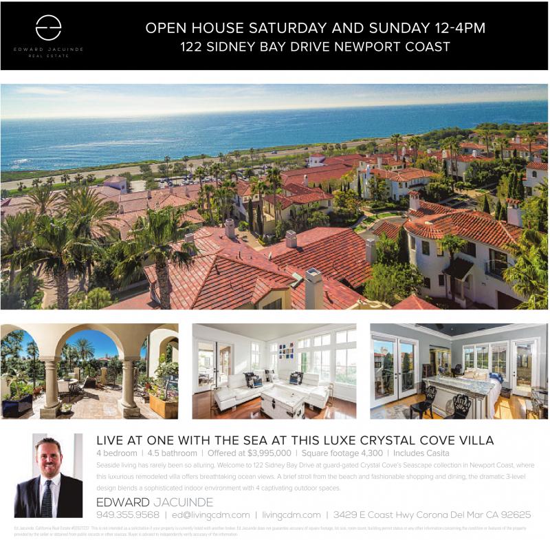 OPEN HOUSE SATURDAY AND SUNDAY 12-4PM 122 SIDNEY BAY DRIVE NEWPORT COAST LIVE AT ONE WITH THE SEA AT THIS LUXE CRYSTAL COVE VILLA 4 bedroom | 4.5 bathroom | Offered at $3,995,000 | Square footage 4,300 | Includes Casita Seaside living has rarely been so alluring. Welcome to 122 Sidney Bay Drive at guard-gated Crystal Cove’s Seascape collection in Newport Coast, where this luxurious remodeled villa offers breathtaking ocean views. A brief stroll from the beach and fashionable shopping and dining, the dramatic 3-level design blends a sophisticated indoor environment with 4 captivating outdoor spaces. EDWARD JACUINDE 949.355.9568 | ed@livingcdm.com | livingcdm.com | 3429 E Coast Hwy Corona Del Mar CA 92625 Ed Jacuinde: California Real Estate #02027237 This is not intended as asolicitation if your property is currently listed with another broker.EdJacuinde does not guarantee accuracy of square footage, lot size, room count, building permit status or any other information concerning the condition or features of the property provided by the seller or obtained from public records or other sources. Buyer is advised to independently verify accuracy of the information.