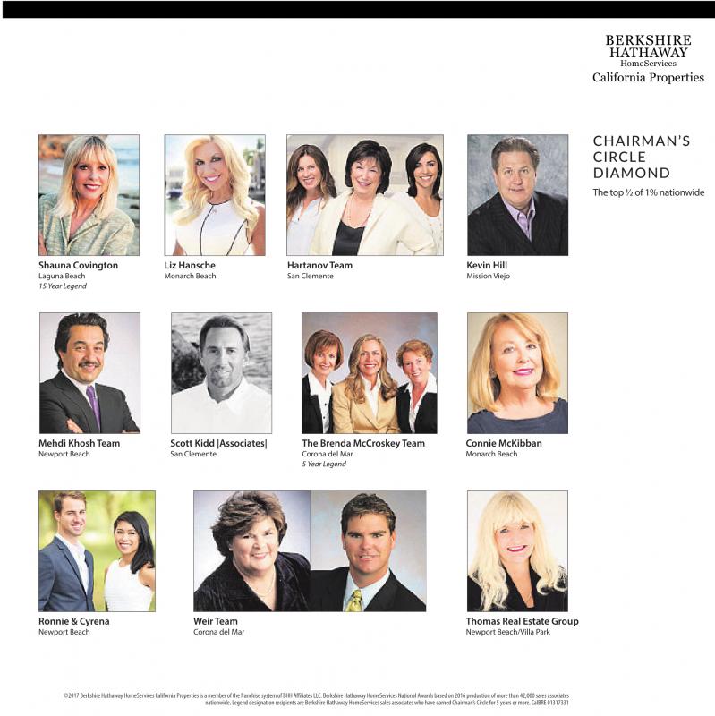 CHAIRMAN’S CIRCLE DIAMOND Thetop ½of1%nationwide Shauna Covington Laguna Beach 15 Year Legend Liz Hansche Monarch Beach HartanovTeam San Clemente Kevin Hill Mission Viejo Mehdi KhoshTeam NewportBeach Scott Kidd |Associates| San Clemente The Brenda McCroskey Team Corona del Mar 5Year Legend Connie McKibban Monarch Beach Ronnie & Cyrena NewportBeach Weir Team Corona del Mar Thomas Real Estate Group NewportBeach/Villa Park ©2017 BerkshireHathawayHomeServices California Properties is amember of the franchise system of BHH AffiliatesLLC.BerkshireHathaway HomeServices National Awards based on 2016 production of morethan42,000 sales associates nationwide.Legend designation recipients areBerkshireHathawayHomeServices sales associateswho have earned Chairman’s Circlefor 5years or more. CalBRE 01317331