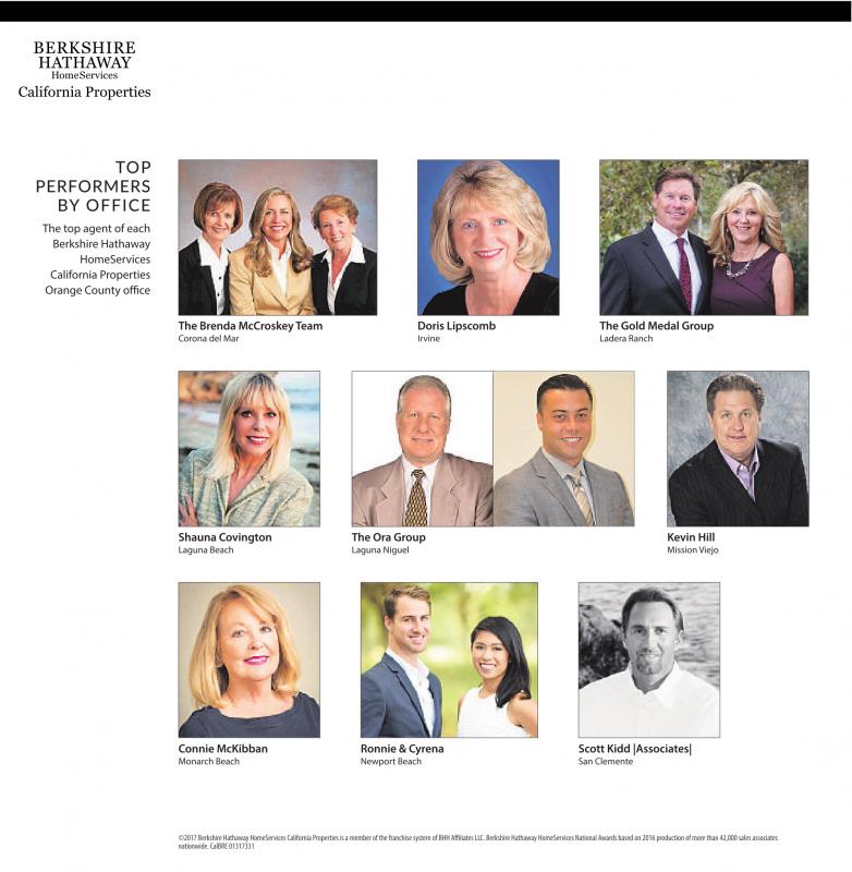 TOP PERFORMERS BY OFFICE The top agent of each Berkshire Hathaway HomeServices California Properties Orange County office TheBrenda McCroskey Team Corona del Mar Doris Lipscomb Irvine TheGold MedalGroup LaderaRanch Shauna Covington Laguna Beach TheOra Group Laguna Niguel Kevin Hill Mission Viejo Connie McKibban Monarch Beach Ronnie &Cyrena NewportBeach Scott Kidd |Associates| San Clemente ©2017 BerkshireHathaway HomeServices California Properties is amember of thefranchise system of BHH AffiliatesLLC.BerkshireHathawayHomeServices National Awards basedon2016 production of morethan42,000 sales associates nationwide.CalBRE 01317331