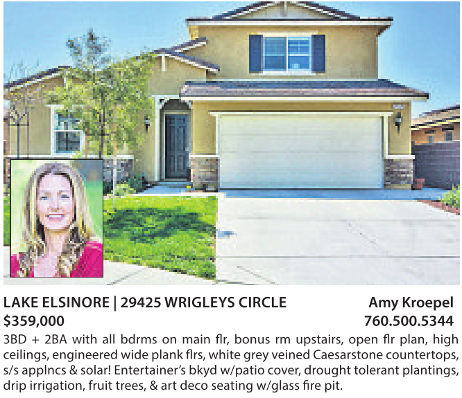$359,000 760.500.5344 3BD + 2BA with all bdrms on main flr, bonus rm upstairs, open flr plan, high ceilings,engineered wide plank flrs,white grey veined Caesarstone countertops,