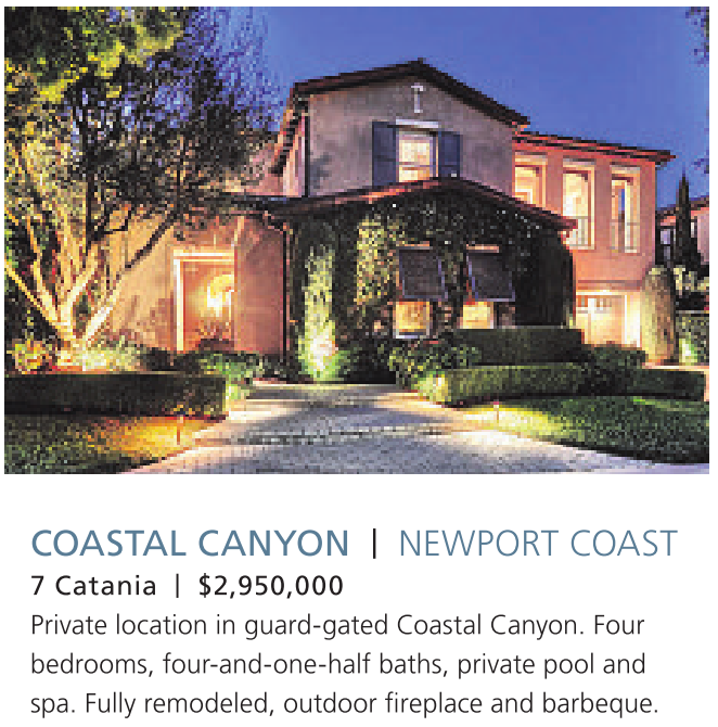 7 Catania | $2,950,000 Private location in guard-gated Coastal Canyon. Four bedrooms, four-and-one-half baths, private pool and spa. Fully remodeled, outdoor fireplace and barbeque.