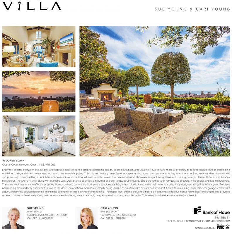 S U E Y O U N G & C A R I Y O U N G 16 DUNES BLUFF Crystal Cove, Newport Coast | $5,075,000 Enjoy the coastal lifestyle in this elegant and sophisticated residence offering panoramic ocean, coastline, sunset, and Catalina views as well as close proximity to rugged coastal hills offering hiking and biking trails, acclaimed restaurants, and world renowned shopping. This chic and inviting home features aspectacular ocean view terrace including an outdoor cooking area, soothing fountain and spa providing a lovely setting in which to entertain or soak in the tranquil and dramatic views. The pristine interiors showcase elegant living areas with soaring ceilings, affluent textures and finishes throughout. The chef’s kitchen stuns with dramatic Lapis Azul granite counters, a 6 burner and grill range, double ovens, Sub Zero refrigerator, refrigerated drawers, wine cooler, and two dishwashers. The main level master suite offers impressive views, spa bath, custom tile work plus a spacious, well organized closet. Also on the main level is a beautifully-designed living area with a grand fireplace and reading area perfectly positioned to takeinthe views, an additional bedroom currently being utilized as an office with custom built-ins and full bath, formal dining room, three car garage replete with agym, and private courtyard offering an intimate setting for alfresco dining or entertaining. The upper level offers athoughtful floor plan featuring aspacious bonus room ideal for lounging and provides access to three professionally designed bedrooms each offering an enchantingly unique style with custom en suite baths. This exceptional residence is not to be missed! SUE YOUNG 949 395 5112 SYOUNG@VILLAREALESTATE.COM CAL BRE No. 01087631 CARI YOUNG 949 290 5906 CARI@VILLAREALESTATE.COM CAL BRE No. 01148961 TIM SIBLEY 949 874 0374 | TIMOTHY.SIBLEY@BANKOFHOPE.COM NMLS No.260939