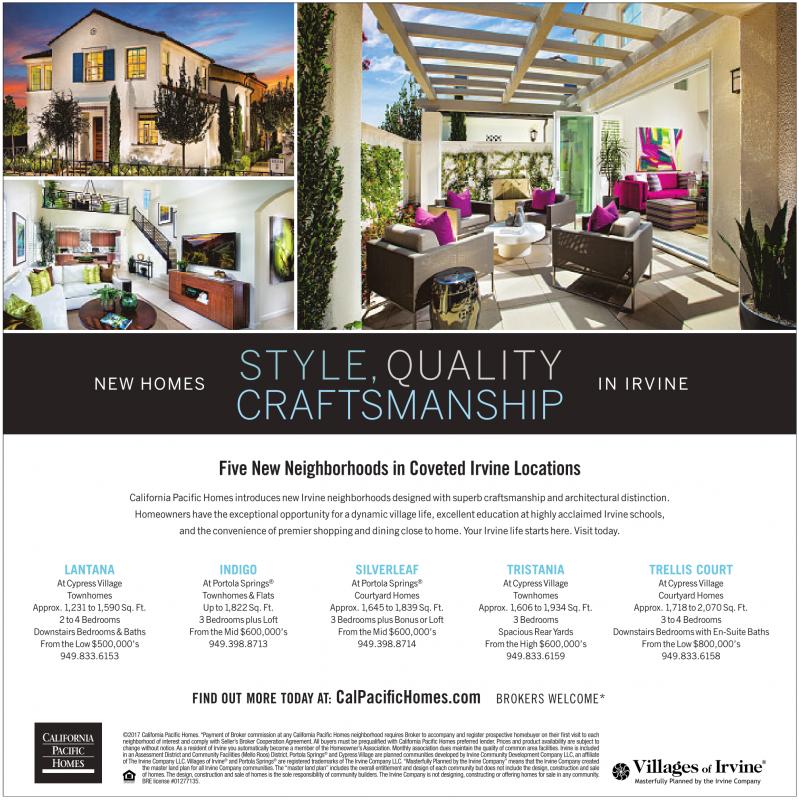 ©2017 California Pacific Homes. *Payment of Broker commission at anyCalifornia Pacific Homes neighborhood requires Broker to accompanyand register prospective homebuyer on their first visit to each neighborhood of interest and comply with Seller’sBroker Cooperation Agreement. All buyers must be prequalified with California Pacific Homes preferred lender.Prices and product availability are subject to change without notice. As aresident of Irvine you automatically become amember of the Homeowner’sAssociation. Monthly association dues maintain the quality of common area facilities. Irvineisincluded in an Assessment District and Community Facilities (Mello Roos) District. Portola Springs ® and Cypress Village are planned communities developed by Irvine Community Development CompanyLLC, an affiliate of The Irvine CompanyLLC.Villages of Irvine ® and Portola Springs ® are registered trademarks of The Irvine CompanyLLC.“Masterfully Planned by the Irvine Company” means thatthe Irvine Companycreated the master land plan for all Irvine Companycommunities.The “master land plan” includes the overall entitlement and design of each community but does not include the design, construction and sale of homes. The design, construction and sale of homes is the sole responsibility of community builders. The Irvine Companyisnot designing, constructing or offering homes for sale in anycommunity. BRE license #01277135.