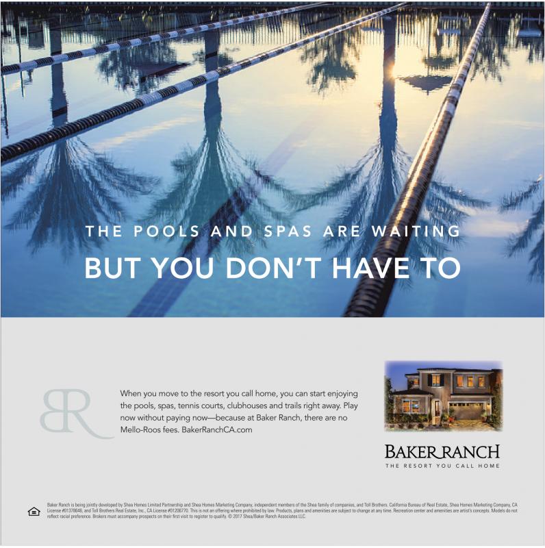 Baker Ranch is being jointly developed by Shea Homes Limited Partnership and Shea Homes Marketing Company,independent members of the Shea family of companies, andToll Brothers. California Bureau of Real Estate, Shea Homes Marketing Company,CA License #01378646, and Toll BrothersReal Estate, Inc., CA License #01206770. This is not an offeringwhereprohibitedbylaw.Products, plans and amenities are subject to change at any time. Recreation center and amenities are artist’sconcepts. Models do not reflect racial preference. Brokers must accompany prospectsontheir first visit to register to qualify.©2017 Shea/BakerRanch Associates LLC.