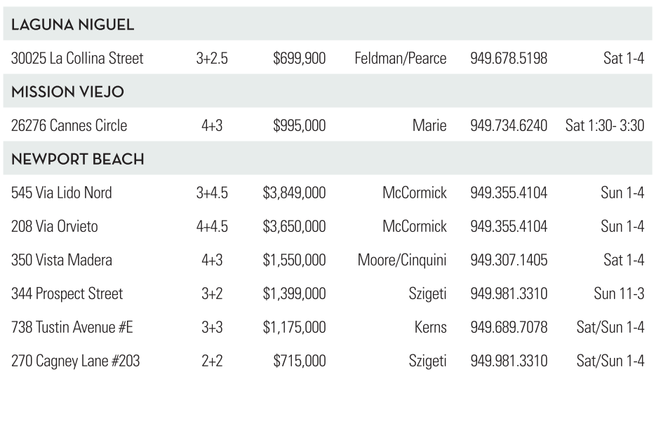 LAGUNA NIGUEL 30025 La Collina Street 3+2.5 $699,900 Feldman/Pearce 949.678.5198 Sat 1-4 MISSION VIEJO 26276 Cannes Circle 4+3 $995,000 Marie 949.734.6240 Sat 1:30- 3:30 NEWPORTBEACH 545 ViaLido Nord 3+4.5 $3,849,000 McCormick 949.355.4104 Sun 1-4 208 ViaOrvieto 4+4.5 $3,650,000 McCormick 949.355.4104 Sun 1-4 350 Vista Madera 4+3 $1,550,000 Moore/Cinquini 949.307.1405 Sat 1-4 344 Prospect Street 3+2 $1,399,000 Szigeti 949.981.3310 Sun 11-3 738 Tustin Avenue #E 3+3 $1,175,000 Kerns 949.689.7078 Sat/Sun 1-4 270 Cagney Lane #203 2+2 $715,000 Szigeti 949.981.3310 Sat/Sun 1-4