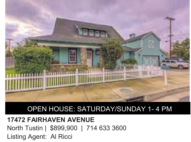 OPEN HOUSE: SATURDAY/SUNDAY 1- 4 PM 17472 FAIRHAVEN AVENUE North Tustin | $899,900 | 714 633 3600 Listing Agent: Al Ricci