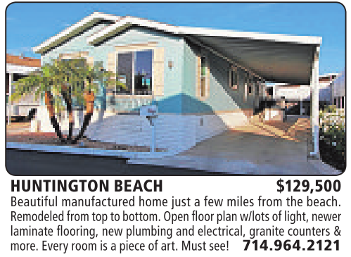 HUNTINGTON BEACH $129,500 Beautiful manufactured home just afew miles from the beach. Remodeledfrom top to bottom. Open floorplanw/lotsoflight,newer laminate flooring, new plumbing and electrical, granite counters & more.Every room is apiece of art. Mustsee! 714.964.2121