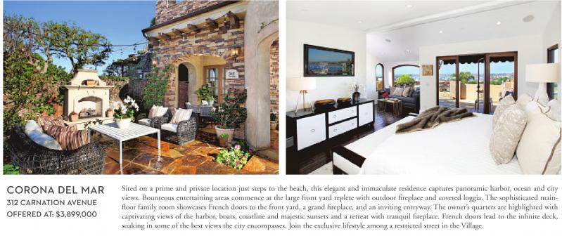 CORONA DEL MAR 312 CARNATION AVENUE OFFERED AT: $3,899,000 Sited on a prime and private location just steps to the beach, this elegant and immaculate residence captures panoramic harbor, ocean and city views. Bounteous entertaining areas commence at the large front yard replete with outdoor fireplace and covered loggia. The sophisticated mainfloor family room showcases French doors to the front yard, a grand fireplace, and an inviting entryway. The owner’s quarters are highlighted with captivating views of the harbor, boats, coastline and majestic sunsets and a retreat with tranquil fireplace. French doors lead to the infinite deck, soaking in some of the best views the city encompasses. Join the exclusive lifestyle among a restricted street in the Village. See also