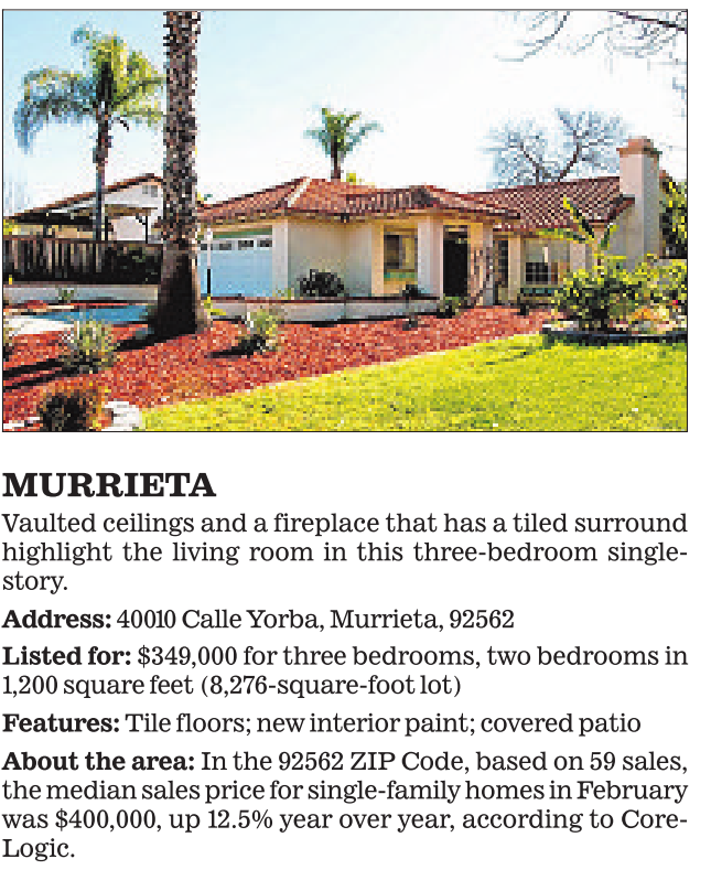 About the area: In the 92562 ZIP Code, based on 59 sales, the median sales price for single-family homes in February was $400,000, up 12.5% year over year, according to Core- Logic.
