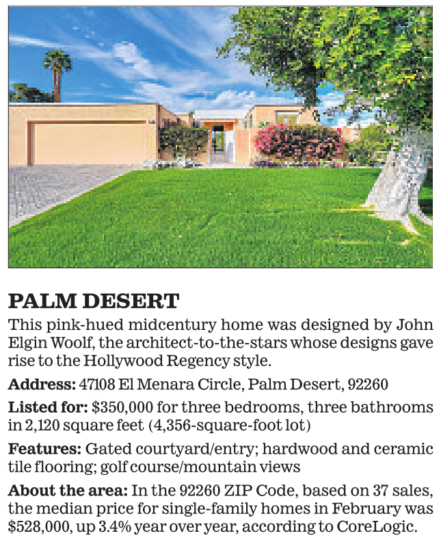 About the area: In the 92260 ZIP Code, based on 37 sales, the median price for single-family homes in February was $528,000, up 3.4% year over year, according to CoreLogic.
