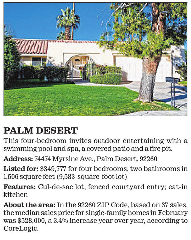 About the area: In the 92260 ZIP Code, based on 37 sales, the median sales price for single-family homes in February was $528,000, a 3.4% increase year over year, according to CoreLogic.