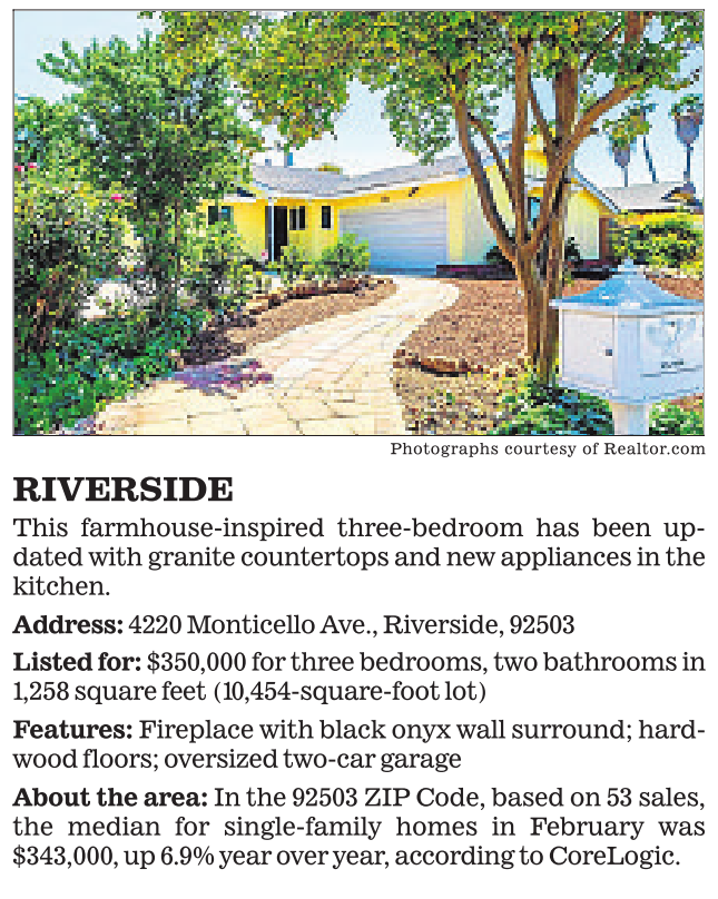 About the area: In the 92503 ZIP Code, based on 53 sales, the median for single-family homes in February was $343,000, up 6.9% year over year, according to CoreLogic.
