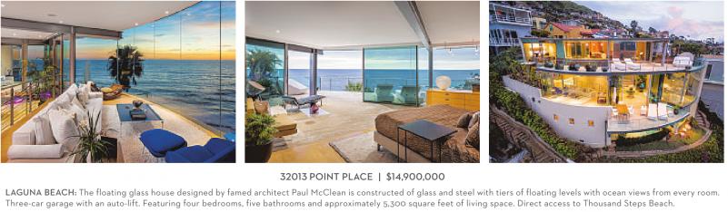 LAGUNA BEACH: The floating glass house designed by famed architect Paul McClean is constructed of glass and steel with tiers of floating levels with ocean views from every room. Three-car garage with an auto-lift. Featuring four bedrooms, five bathrooms and approximately 5,300 square feet of living space. Direct access to Thousand Steps Beach.