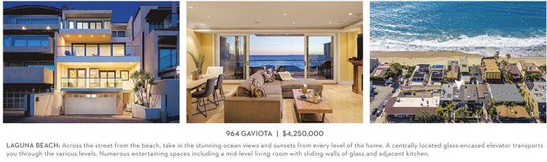 LAGUNA BEACH: Across the street from the beach, take in the stunning ocean views and sunsets from every level of the home. A centrally located glass-encased elevator transports you through the various levels. Numerous entertaining spaces including a mid-level living room with sliding walls of glass and adjacent kitchen.