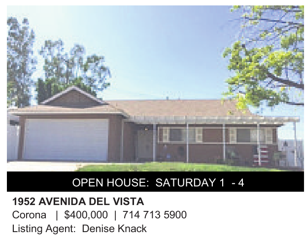 OPEN HOUSE: SATURDAY 1 - 4 1952 AVENIDADEL VISTA Corona | $400,000 | 714 713 5900 Listing Agent: Denise Knack