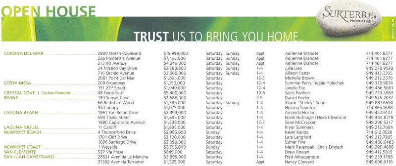 CORONA DEL MAR ........................................... 2900 Ocean Boulevard $19,999,000 Saturday | Sunday Appt. Adrienne Brandes 714.401.8277 226 Poinsettia Avenue $7,495,000 Saturday | Sunday Appt. Adrienne Brandes 714.401.8277 213 Iris Avenue $4,349,000 Saturday | Sunday Appt. Adrienne Brandes 714.401.8277 24 Mission Bay Drive $2,788,800 Saturday | Sunday 1-4 Julia Liao 949.278.9528 716 Orchid Avenue $2,600,000 Saturday | Sunday 1-4 Allison Foster 949.413.3335 2681 Point Del Mar $1,895,000 Saturday 12-3 Michelle Brown 949.212.2576 COSTA MESA ..................................................... 209 Broadway $1,150,000 Saturday 12-4 Summer Perry | Jessie Holechek 949.375.9074 151 23 rd Street $1,049,000 Saturday 12-4 Janelle File 949.466.5661 CRYSTAL COVE | Custom Homesite .................... 48 Deep Sea* $5,300,000 Saturday 10-5 Sales Pavilion 949.720.2683 IRVINE ................................................................ 139 Sunset Cove $2,688,000 Saturday 2-5 Daniel Finder 949.545.2037 66 Berkshire Wood $1,389,000 Saturday | Sunday 1-4 Xiaoxi "Shirley" Song 949.887.6690 94 Canopy $1,075,000 Saturday 1-4 Hosana Saputra 714.865.1688 LAGUNA BEACH................................................ 1961 San Remo Drive $2,399,000 Saturday 1-4 Amanda Horton 949.422.6122 594 Thalia Street $1,895,000 Saturday 1-4 Frank Hufnagel | Heidi Cleveland 949.444.8718 1880 Capistrano Avenue $1,239,000 Saturday 12-3 Sean McCracken 949.290.5317 LAGUNA NIGUEL............................................... 11 Cardiff $1,695,000 Saturday 1-4 Pryor Summers 949.212.7004 NEWPORT BEACH ............................................. 4 Thunderbird Drive $2,995,000 Sunday 1-4 Kevin Kanda 714.612.0529 1701 Cliff Drive $2,100,000 Saturday 1-4 Lara Langford 949.212.7265 1606 Santiago Drive $2,099,000 Saturday 1-4 Esther Fine 949.466.6483 NEWPORT COAST ............................................. 1 Wayside $3,595,000 Sunday 1-4 Mark Ravanpak | Shala Emdadi 949.395.4688 SAN CLEMENTE ................................................. 527 Via Presa $849,000 Saturday 1-4 Drew Rowan 949.412.5815 SAN JUAN CAPISTRANO................................... 28521 Avenida La Mancha $3,895,000 Saturday 1-4 Fred Albuquerque 949.233.1788 31302 Avenida Terramar $1,525,000 Saturday Appt. Nancy Cloward 949.606.6116