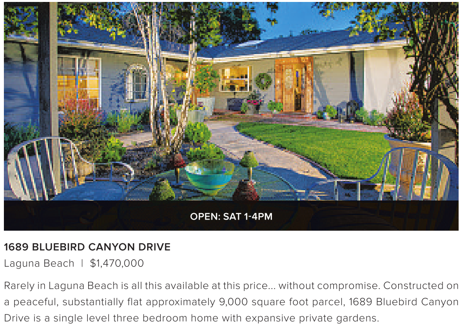 OPEN: SAT 1-4PM 1689 BLUEBIRD CANYON DRIVE Laguna Beach | $1,470,000 Rarely in Laguna Beach is all this available at this price... without compromise. Constructed on a peaceful, substantially flat approximately 9,000 square foot parcel, 1689 Bluebird Canyon Drive is a single level three bedroom home with expansive private gardens. See also