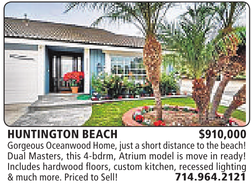 HUNTINGTON BEACH $910,000 Gorgeous Oceanwood Home,just ashortdistancetothe beach! Dual Masters, this 4-bdrm, Atrium model ismove in ready! Includes hardwood floors, custom kitchen, recessed lighting &much more.PricedtoSell! 714.964.2121