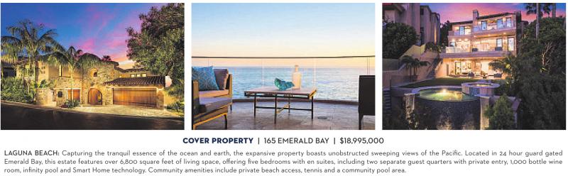 COVER PROPERTY | 165 EMERALD BAY | $18,995,000 LAGUNA BEACH: Capturing the tranquil essence of the ocean and earth, the expansive property boasts unobstructed sweeping views of the Pacific. Located in 24 hour guard gated Emerald Bay, this estate features over 6,800 square feet of living space, offering five bedrooms with en suites, including two separate guest quarters with private entry, 1,000 bottle wine room, infinity pool and Smart Home technology. Community amenities include private beach access, tennis and a community pool area.