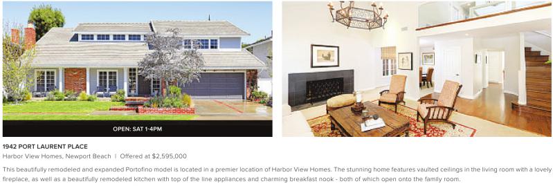 OPEN: SAT 1-4PM 1942 PORT LAURENT PLACE Harbor View Homes, Newport Beach | Offered at $2,595,000 This beautifully remodeled and expanded Portofino model is located in a premier location of Harbor View Homes. The stunning home features vaulted ceilings in the living room with a lovely fireplace, as well as a beautifully remodeled kitchen with top of the line appliances and charming breakfast nook - both of which open onto the family room. See also