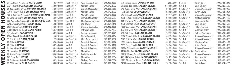 6shephardcourt, LADERARANCH $695,000 Sun 2-5 Ralph Balo 949.322.1240 6Rockledge Road, LAGUNA BEACH $11,950,000 Sat 1-4 Mark Christy 949.235.2538 645 Buena Vista Way, LAGUNA BEACH $3,995,000 Sat/Sun 1-4 Shauna Covington 949.412.8088 1088Del Mar, LAGUNA BEACH $3,500,000 Sat/Sun 1-5 Byron Savon 949.793.4224 649 Anita Street, LAGUNA BEACH $3,149,000 Sat 1-4 Shauna Covington 949.412.8088 2556 Temple Hills Drive, LAGUNA BEACH $2,950,000 Sat/Sun 1-4 Kristine Torrance 949.637.1160 461 AltaVista Way, LAGUNA BEACH $2,875,000 Sun 1-4 Suzanne Taylor 949.303.8346 2828 BernardCourt, LAGUNA BEACH $2,695,000 Sat/Sun 1-4 MarkChristy 949.235.2538 1555 Caribbean Way, LAGUNA BEACH $2,675,000 Sat/Sun 1-4 HillaryCaston 949.922.8490 432 AltaVista Way, LAGUNA BEACH $2,595,000 Sat 1-4 Suzanne Taylor 949.303.8346 564 Oak Street, LAGUNA BEACH $2,375,000 Sat/Sun 1-4 Delores Sherman 949.689.3429 2400 Temple Hills Drive, LAGUNA BEACH $2,195,000 Sat/Sun1-4 Shauna Covington 949.412.8088 2975 Chillon Way, LAGUNA BEACH $1,995,000 Sat 1-4 Shauna Covington 949.412.8088 1039 KatellaStreet, LAGUNA BEACH $1,850,000 Sat/Sun 1-4 WinstonWest 949.637.6133 2965 TerryRoad, LAGUNA BEACH $1,749,000 Sun 1-4 Susan Neely 949.499.5900 21576 Treetop Lane, LAGUNA BEACH $1,599,000 Sun 1-4 Shauna Covington 949.412.8088 31906 9th Ave, LAGUNA BEACH $1,195,000 Sat9-12/Sun 3-6 BruceMiller 949.686.8686 21712 Wesley Drive7,LAGUNA BEACH $1,149,000 Sat/Sun 1-4 Shauna Covington 949.412.8088 440 #4 Cypress Drive, LAGUNA BEACH $1,095,000 Sat/Sun 1-4 Ken Hanzlik 949.338.1666 2225 GlenneyreStreet F, LAGUNA BEACH $879,000 Sun 1-4 Ken Hanzlik 949.338.1666 27088Ironwood Drive, LAGUNA HILLS $1,100,000 Sat 1-5 Jim Bishop 949.464.8136