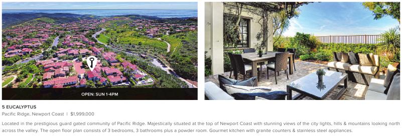 5 EUCALYPTUS Pacific Ridge, Newport Coast | $1,999,000 Located in the prestigious guard gated community of Pacific Ridge. Majestically situated at the top of Newport Coast with stunning views of the city lights, hills & mountains looking north across the valley. The open floor plan consists of 3 bedrooms, 3 bathrooms plus a powder room. Gourmet kitchen with granite counters & stainless steel appliances.