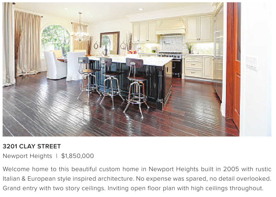 3201 CLAY STREET Newport Heights | $1,850,000 Welcome home to this beautiful custom home in Newport Heights built in 2005 with rustic Italian & European style inspired architecture. No expense was spared, no detail overlooked. Grand entry with two story ceilings. Inviting open floor plan with high ceilings throughout.