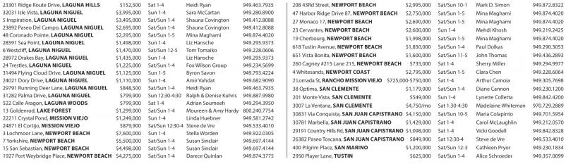 23301Ridge RouteDrive, LAGUNA HILLS $152,500 Sat 1-4 Heidi Ryan 949.463.7935 32031 Isle Vista, LAGUNA NIGUEL $3,995,000 Sun 1-4 Sara McCartan 949.280.8900 5Inspiration, LAGUNA NIGUEL $3,495,000 Sat/Sun 1-4 Shauna Covington 949.412.8088 23892 PaseoDel Campo, LAGUNA NIGUEL $2,695,000 Sat/Sun 1-4 Shauna Covington 949.412.8088 48 Coronado Pointe, LAGUNA NIGUEL $2,295,000 Sat/Sun 1-5 Mina Maghami 949.874.4020 28591 SeaPoint, LAGUNA NIGUEL $1,498,000 Sun 1-4 Liz Hansche 949.295.9373 6Westcliff, LAGUNA NIGUEL $1,470,000 Sat/Sun 12-5 TomTomaiko 949.228.0606 28972 Drakes Bay, LAGUNA NIGUEL $1,435,000 Sun 1-4 Liz Hansche 949.295.9373 24 Trestles, LAGUNA NIGUEL $1,225,000 Sat/Sun 1-4 FoxWilson Group 949.234.5699 31494 Flying Cloud Drive, LAGUNA NIGUEL $1,125,000 Sun 1-5 Byron Savon 949.793.4224 24021 DoryDrive, LAGUNA NIGUEL $1,110,000 Sun 1-4 Amir Vahdat 949.682.9090 29791Running Deer Lane, LAGUNA NIGUEL $848,500 Sat/Sun 1-4 Heidi Ryan 949.463.7935 31282Palma Drive, LAGUNA NIGUEL $799,900 Sun 12:30-4:30 Ralph &DeniseKuhns 949.887.9980 522 CalleAragon, LAGUNA WOODS $799,900 Sat 1-4 Adrian Soumeeh 949.294.3950 13 Goldenrod, LAKE FOREST $1,299,000 Sat/Sun 1-4 Moureen &Amy Hardy 800.240.7754 22211 Crystal Pond, MISSION VIEJO $1,249,000 Sun 1-4 Linda Huebner 949.581.2742 24871 El Cortijo, MISSION VIEJO $879,900 Sat/Sun 12:30-4 StevedeVre 949.533.4010 3Lochmoor Lane, NEWPORT BEACH $7,600,000 Sun 1-4 Stella Worden 949.922.0305 7Yorkshire, NEWPORT BEACH $5,500,000 Sat/Sun 1-4 Susan Sinclair 949.697.4144 15 San Sebastian, NEWPORT BEACH $4,498,000 Sat/Sun 1-4 Susan Sinclair 949.697.4144 1927 Port Weybridge Place, NEWPORT BEACH $4,275,000 Sat/Sun 1-4 DareceQuinlan 949.874.3775